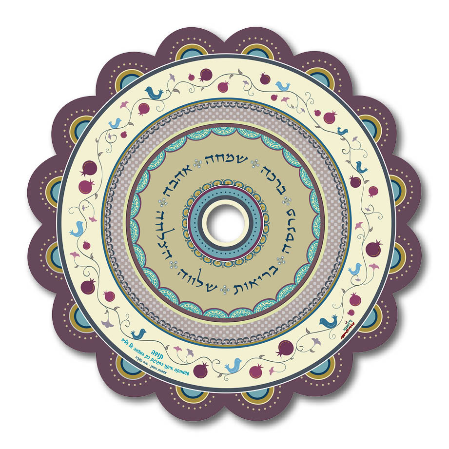 עיצוב מרהיב בגווני סגול חציל ושמנת המשלב איורים של רימונים ומגוון עיטורים היוצרים עיצוב עדין ומיוחד.